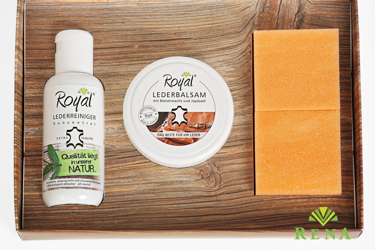 1 x hochwertige Geschenkbox in Holzoptik, 1 x Royal® Lederbalsam 125 ml, 1 x Royal® Lederreiniger 125 ml sowie 2 Anwendungsschwämme.